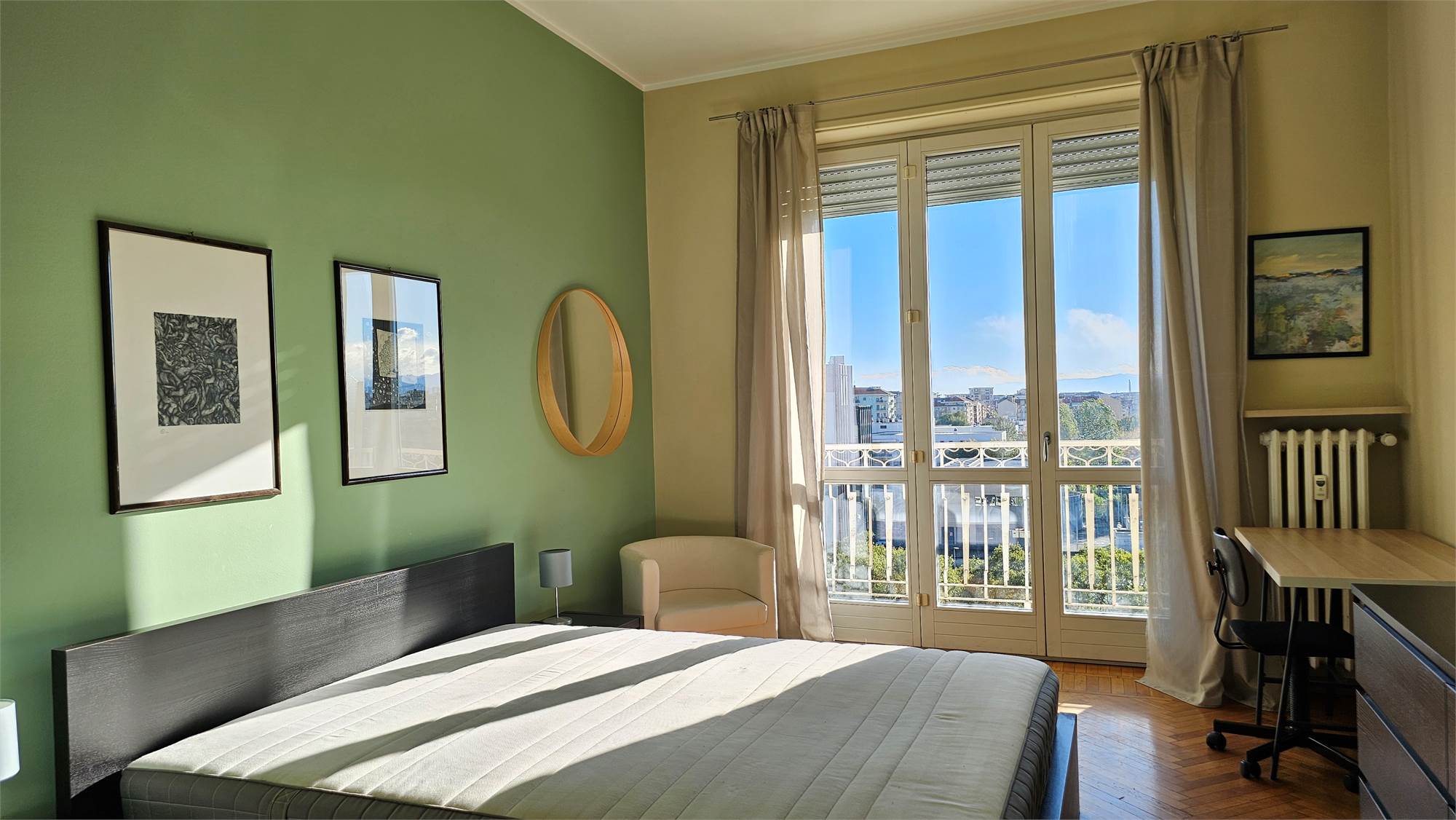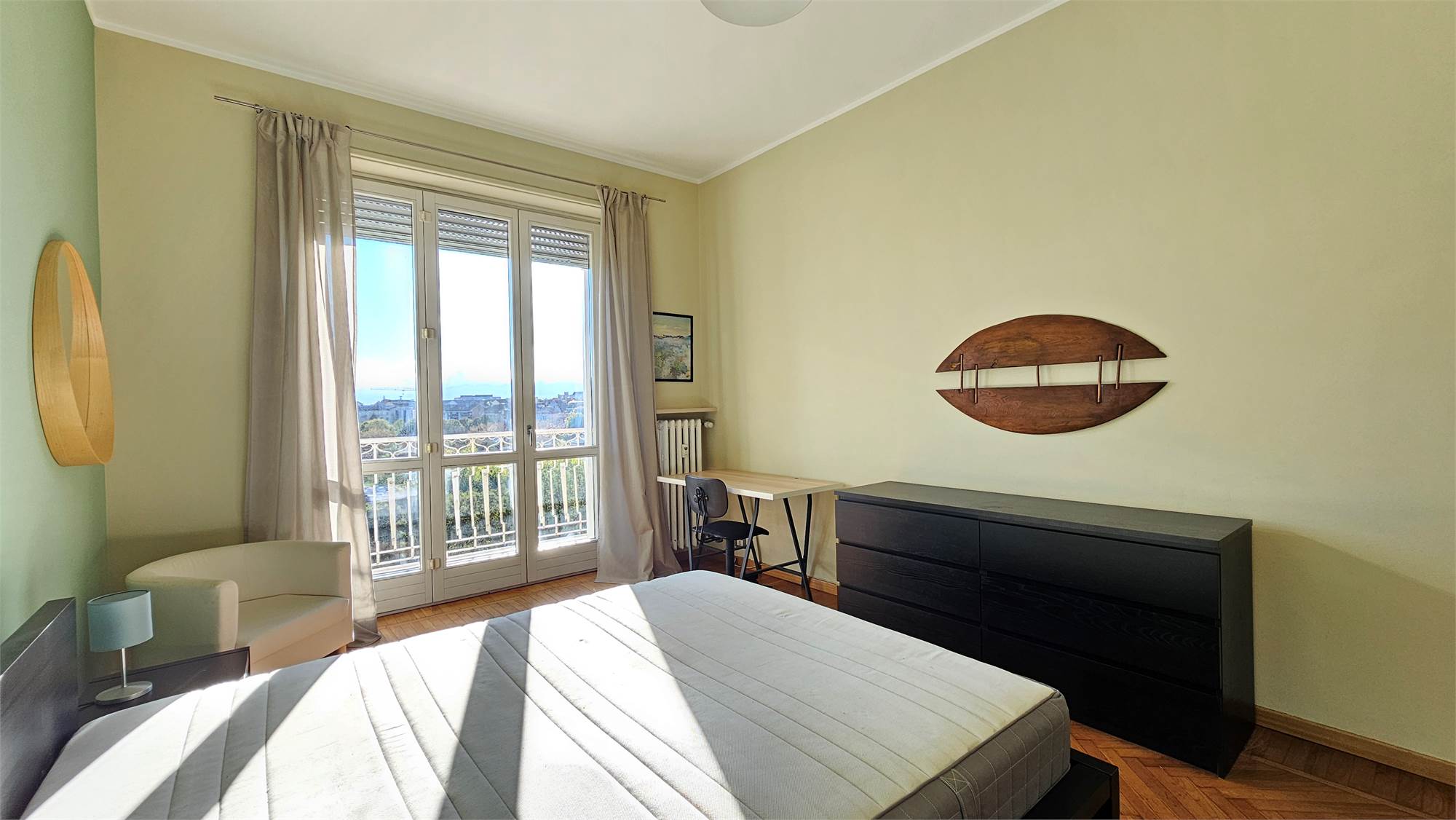 L’appartamento, rifinito con gusto e materiali di pregio. E arredato con ottimi arredi, si compone di un ampio ingresso, luminoso tinello con cucinino separato, grande camera da letto matrimoniale, bagno moderno con vasca, doccia e termoarredo, ripostiglio e due balconi. Gli ambienti sono spaziosi, curati e godono di una vista panoramica e aperta su Torino.