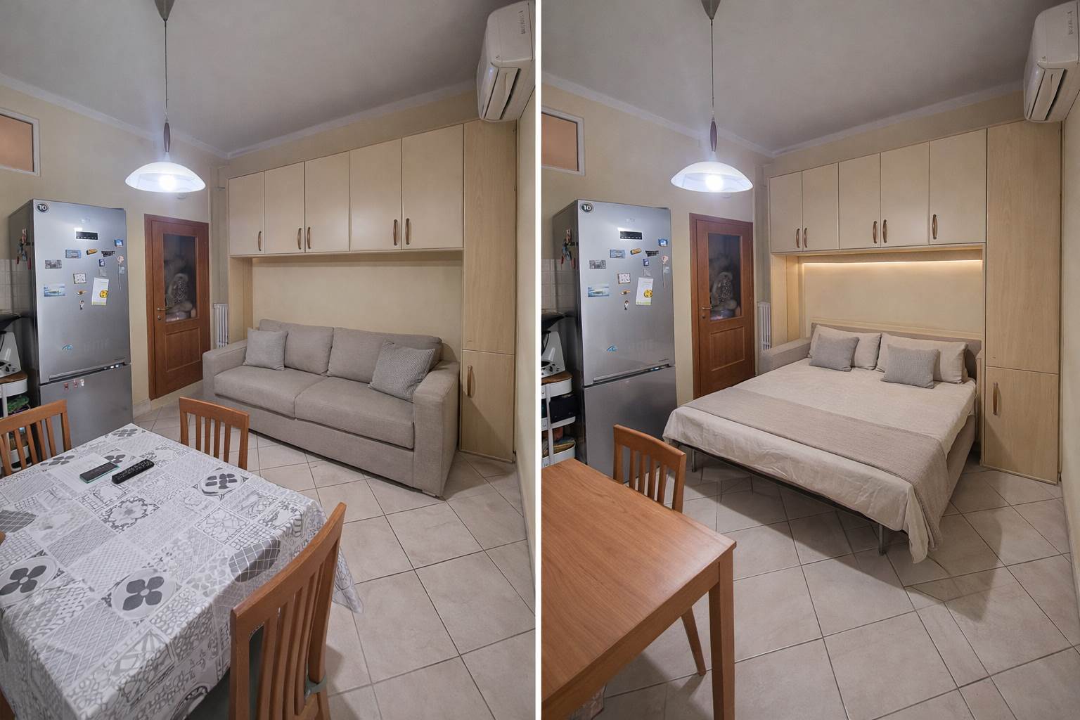 – soggiorno con cucina a vista, tavolo e divano letto
