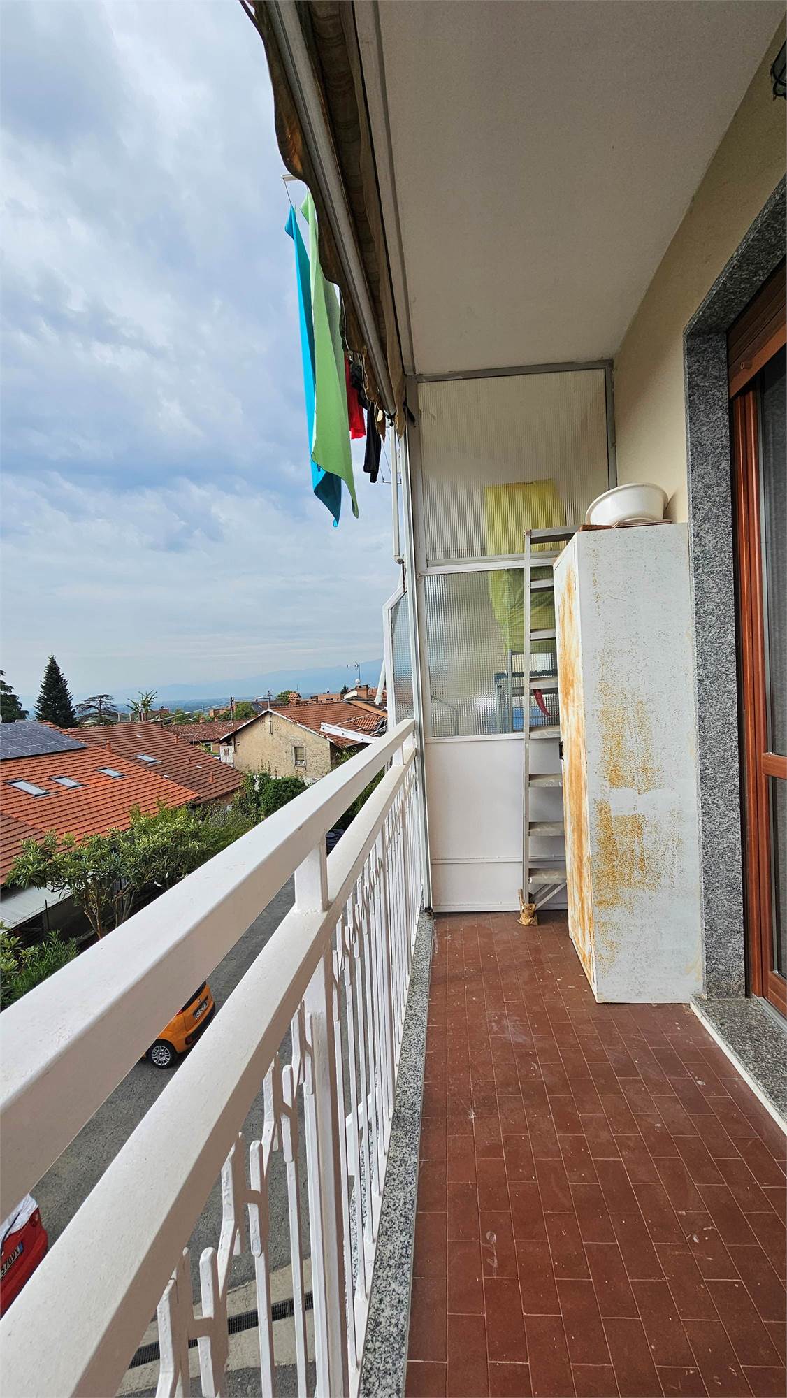 Attualmente è composto da ingresso ampio con vista su ampia sala con cucina a vista, zona studiolo in fondo al corridoio, camera, bagno, 2 balconi, cantina e box auto