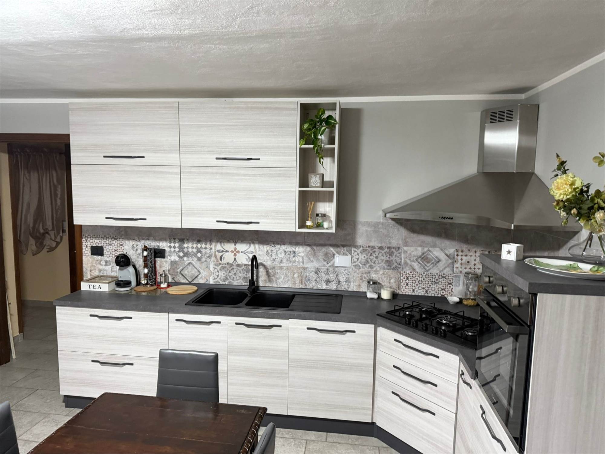 Attraversando l’ampio giardino di proprietà, si accede all’abitazione , disposta su due livelli , dove al piano terra troviamo la zona giorno, composta un ampio soggiorno con camino, una cucina abitabile di generosa metratura, un bagno ,una lavanderia ed un ripostiglio.