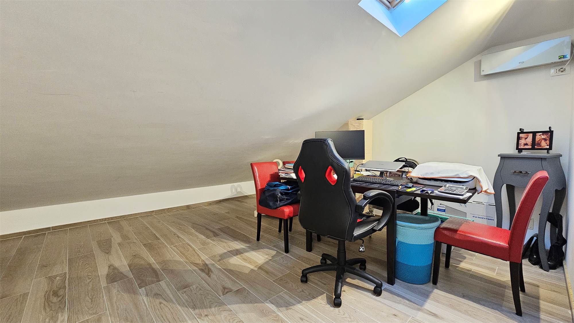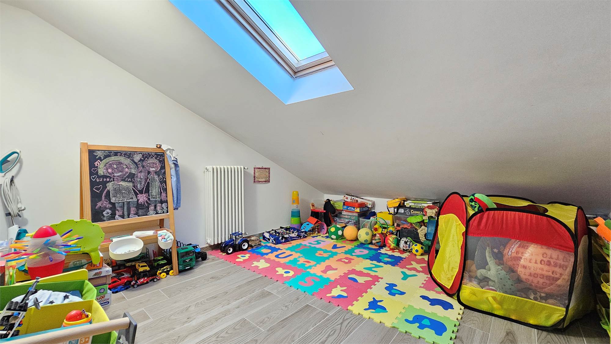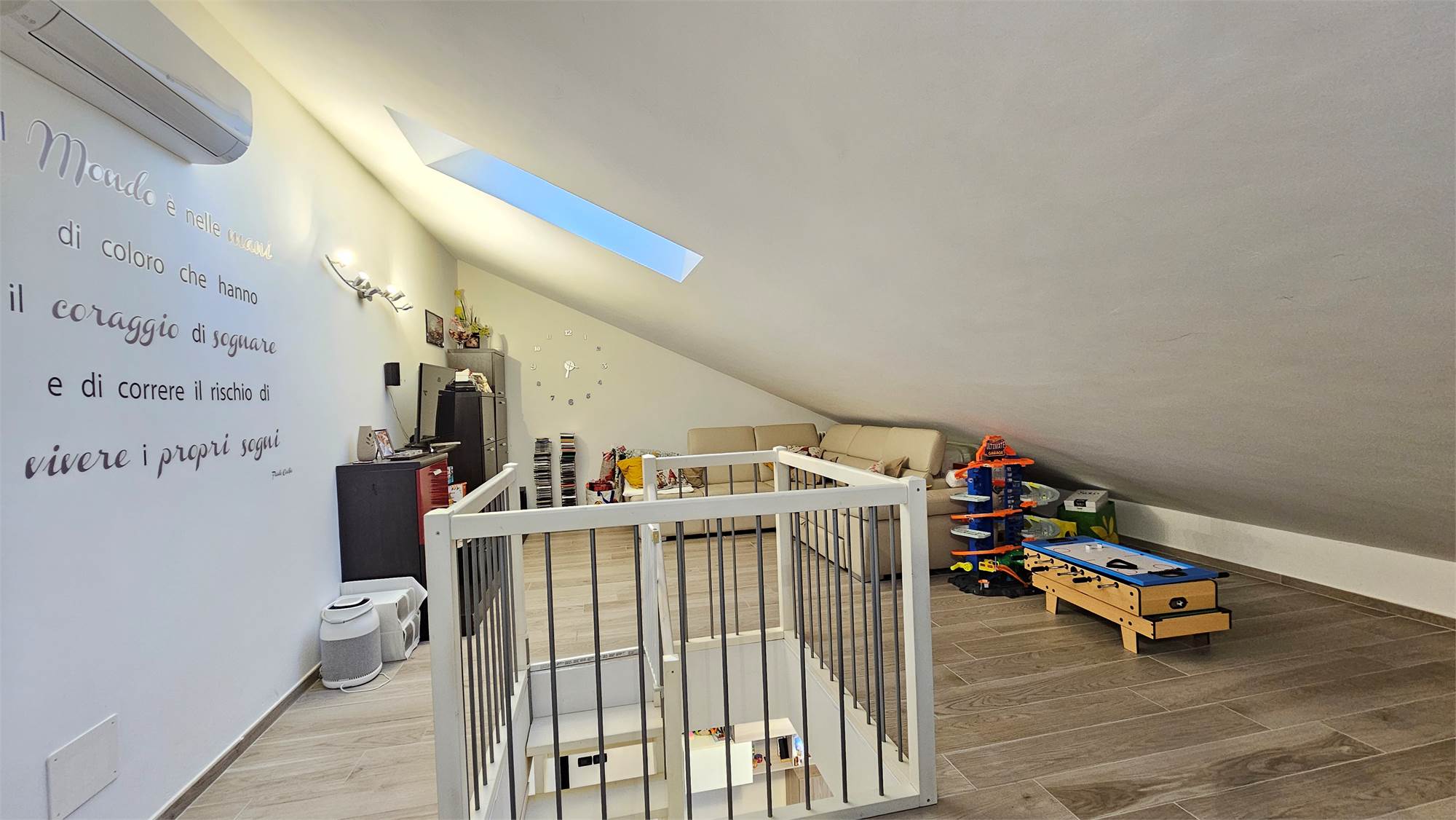 Una scala interna in legno conduce al piano superiore, dove troviamo un sottotetto completamente rifinito, suddiviso in due ambienti oltre a una comoda lavanderia. Questo livello è dotato di aria condizionata e lucernari, che garantiscono ottima luminosità e comfort.