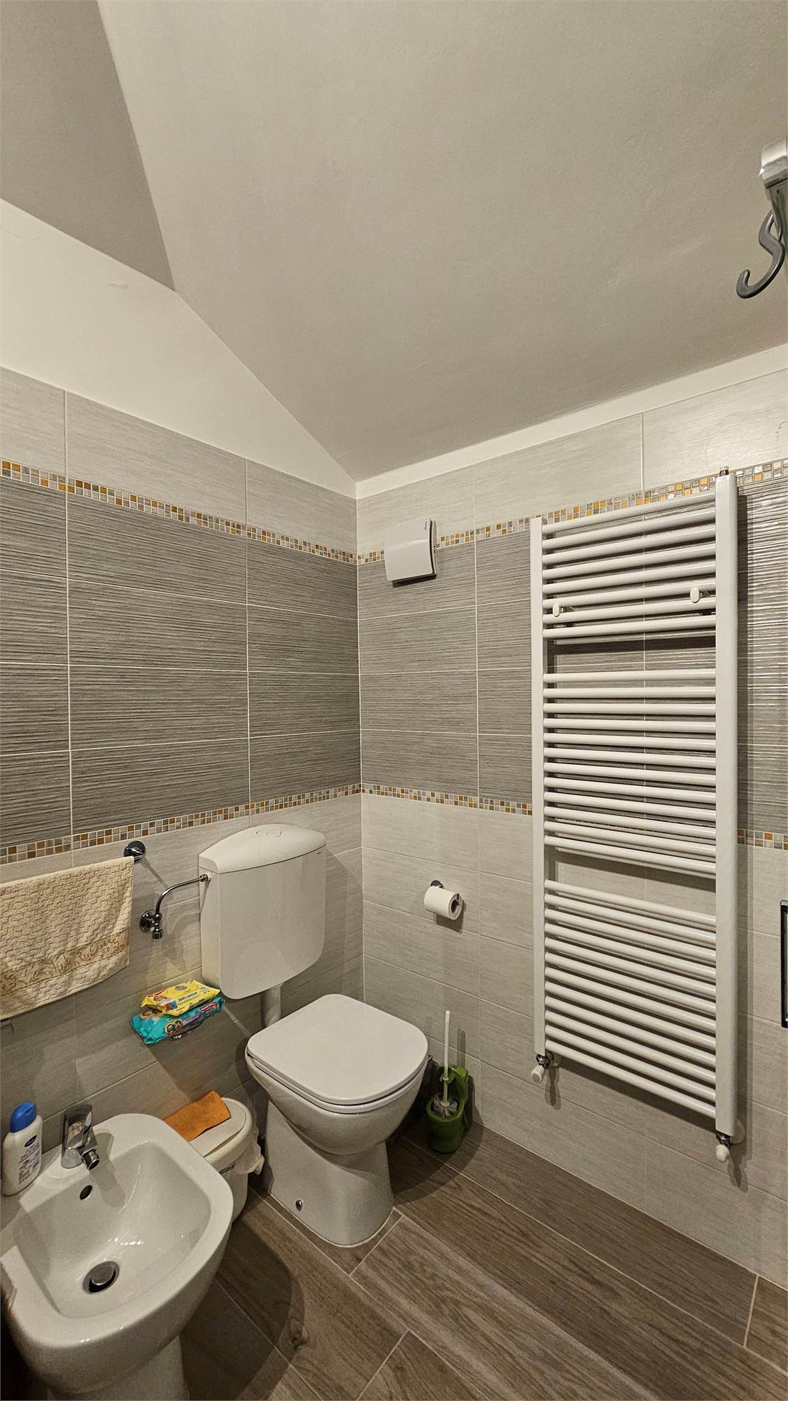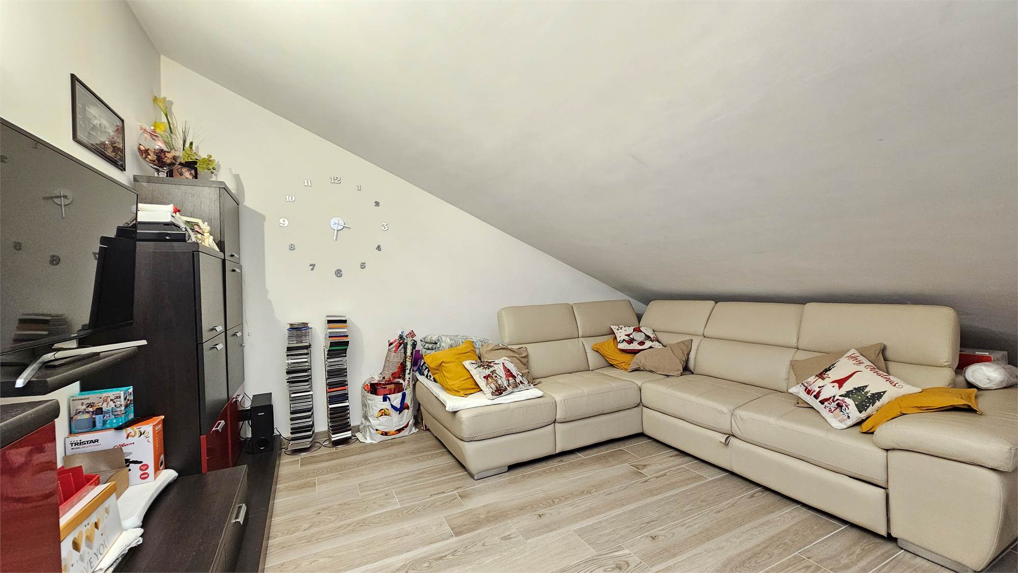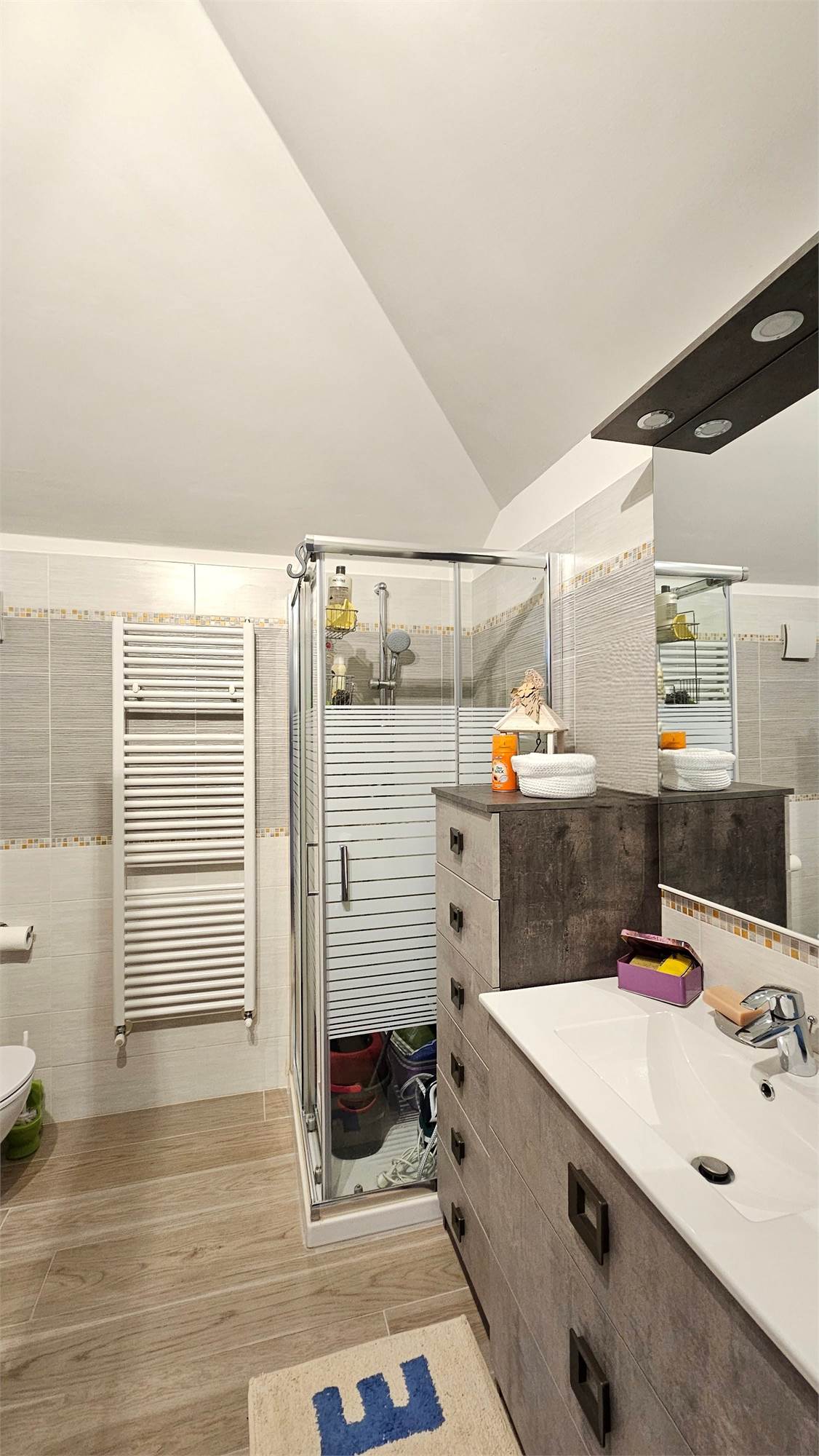 Una scala interna in legno conduce al piano superiore, dove troviamo un sottotetto completamente rifinito, suddiviso in due ambienti oltre a una comoda lavanderia. Questo livello è dotato di aria condizionata e lucernari, che garantiscono ottima luminosità e comfort.
