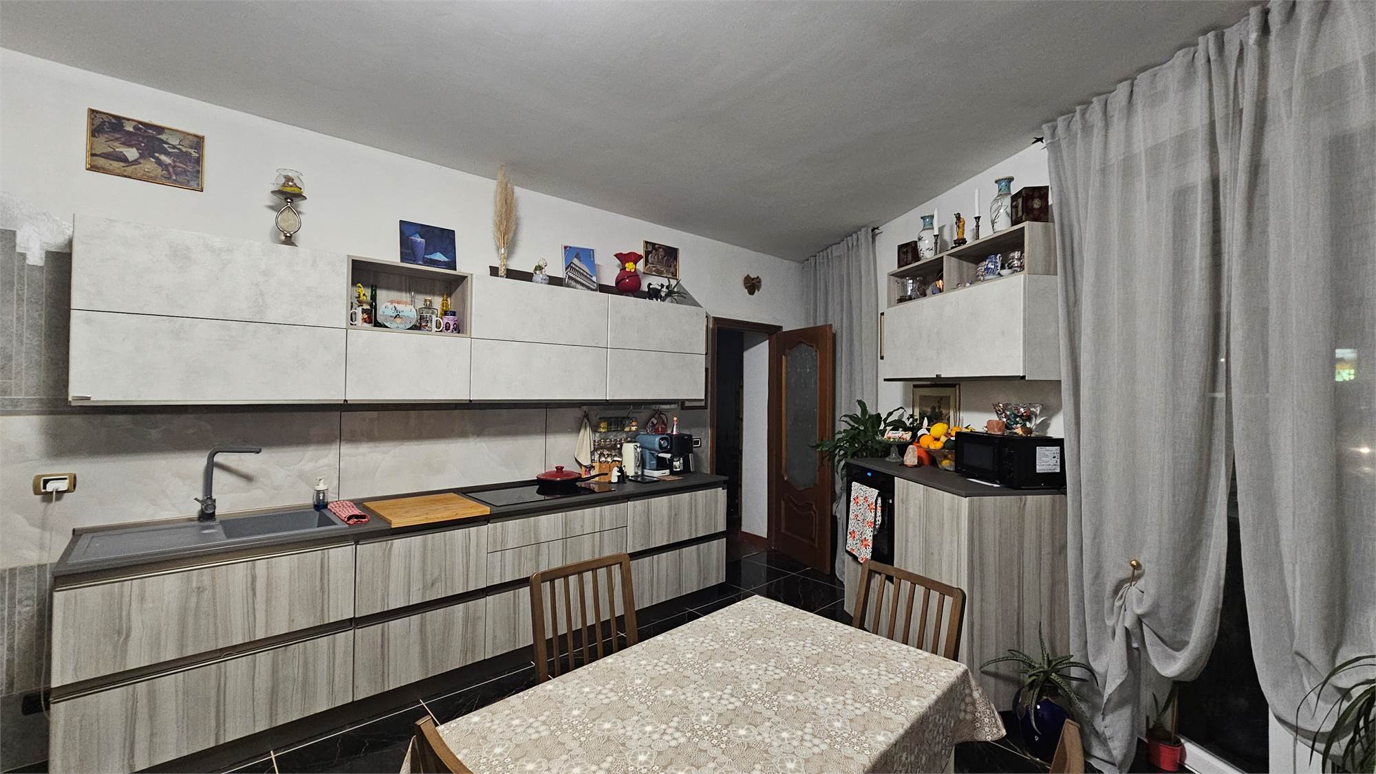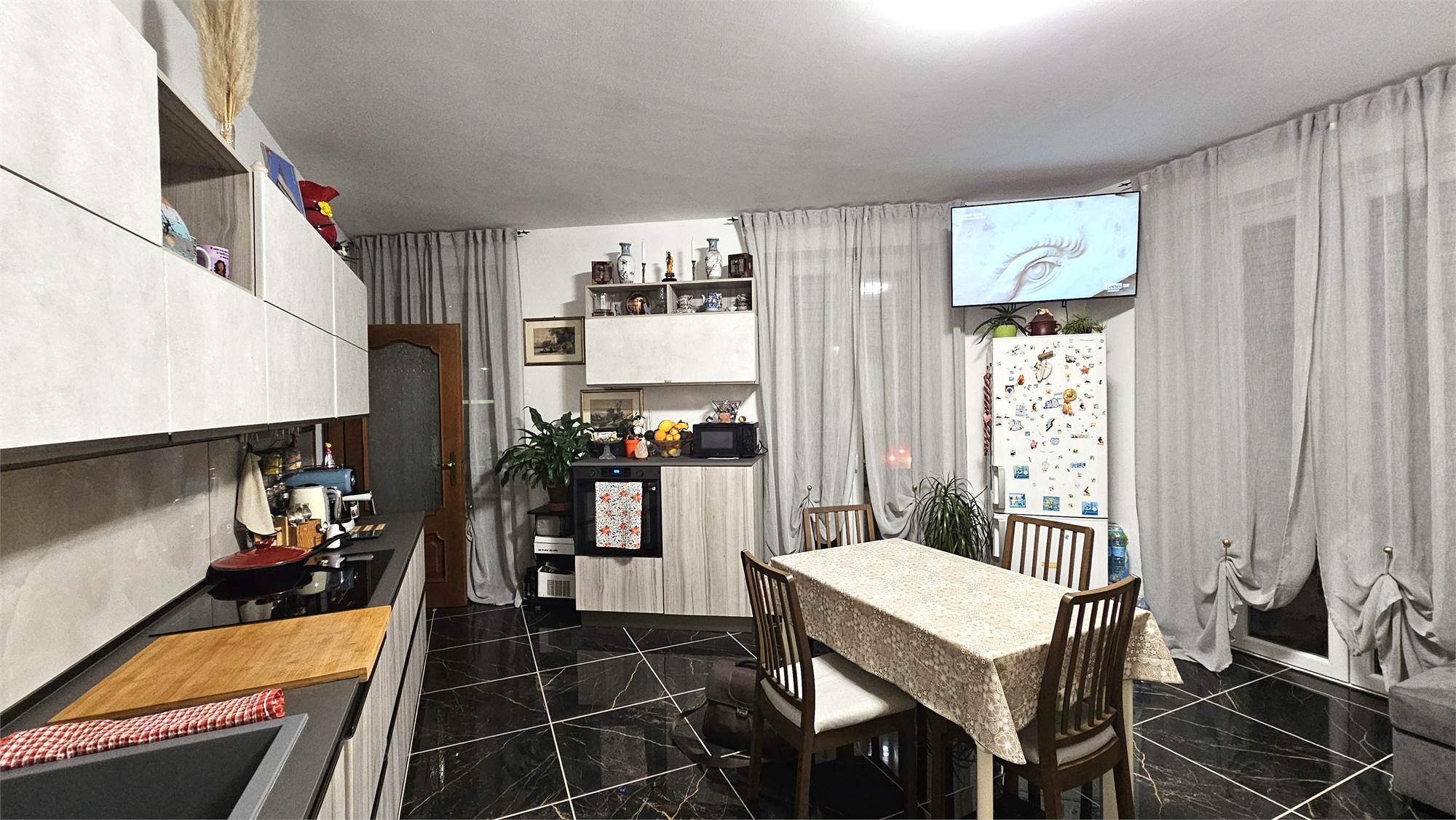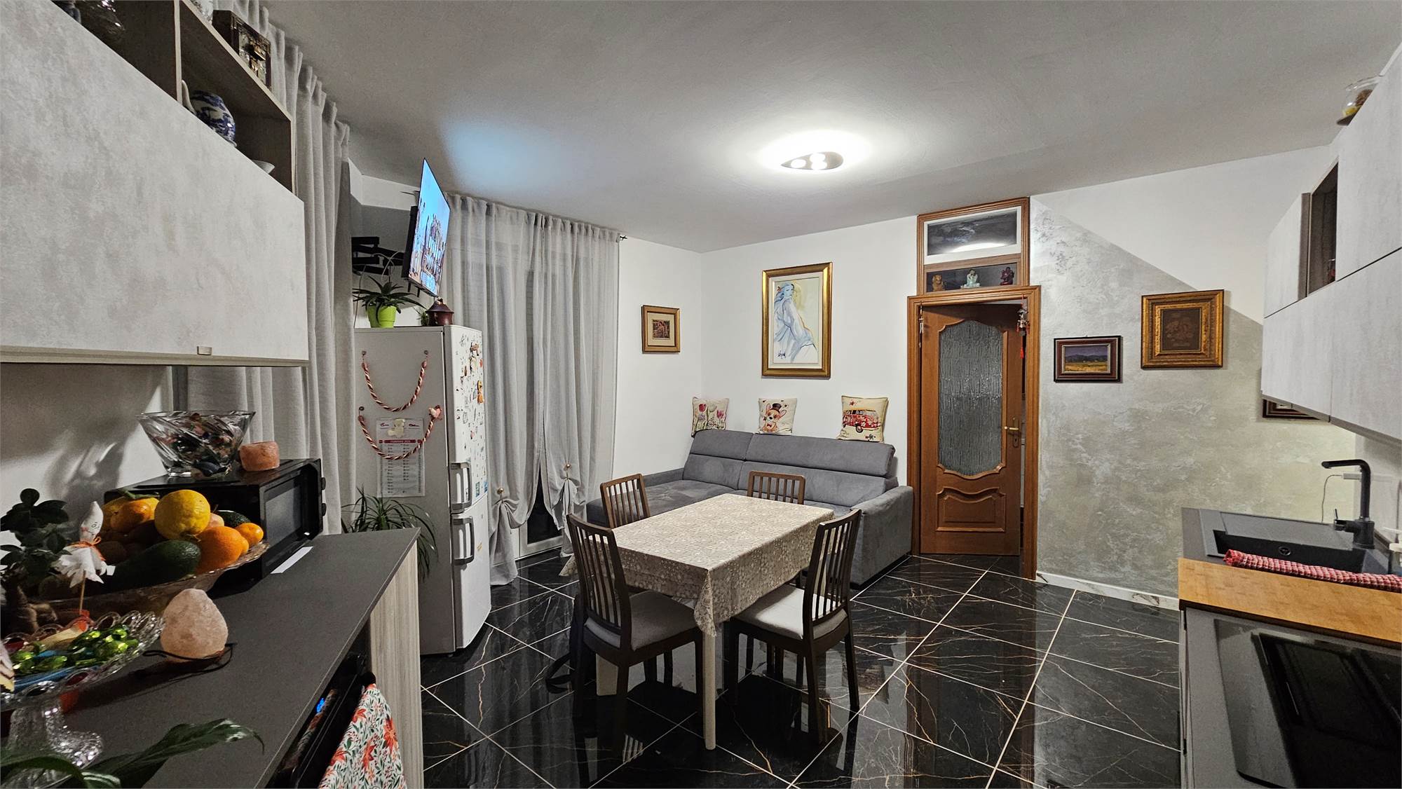 La zona giorno è composta da un soggiorno luminoso con cucina a vista, ideale per la vita quotidiana e per accogliere ospiti.